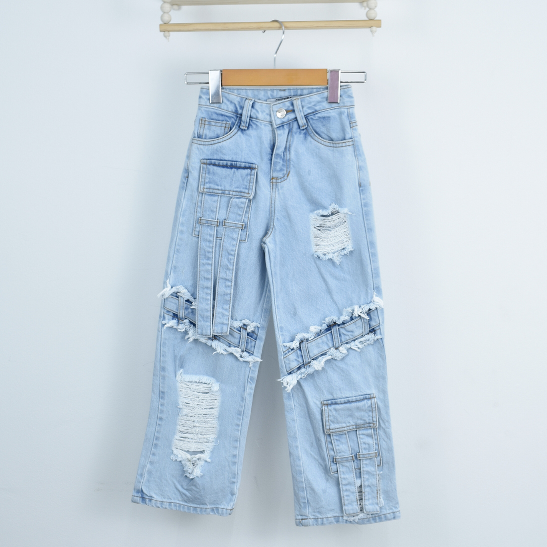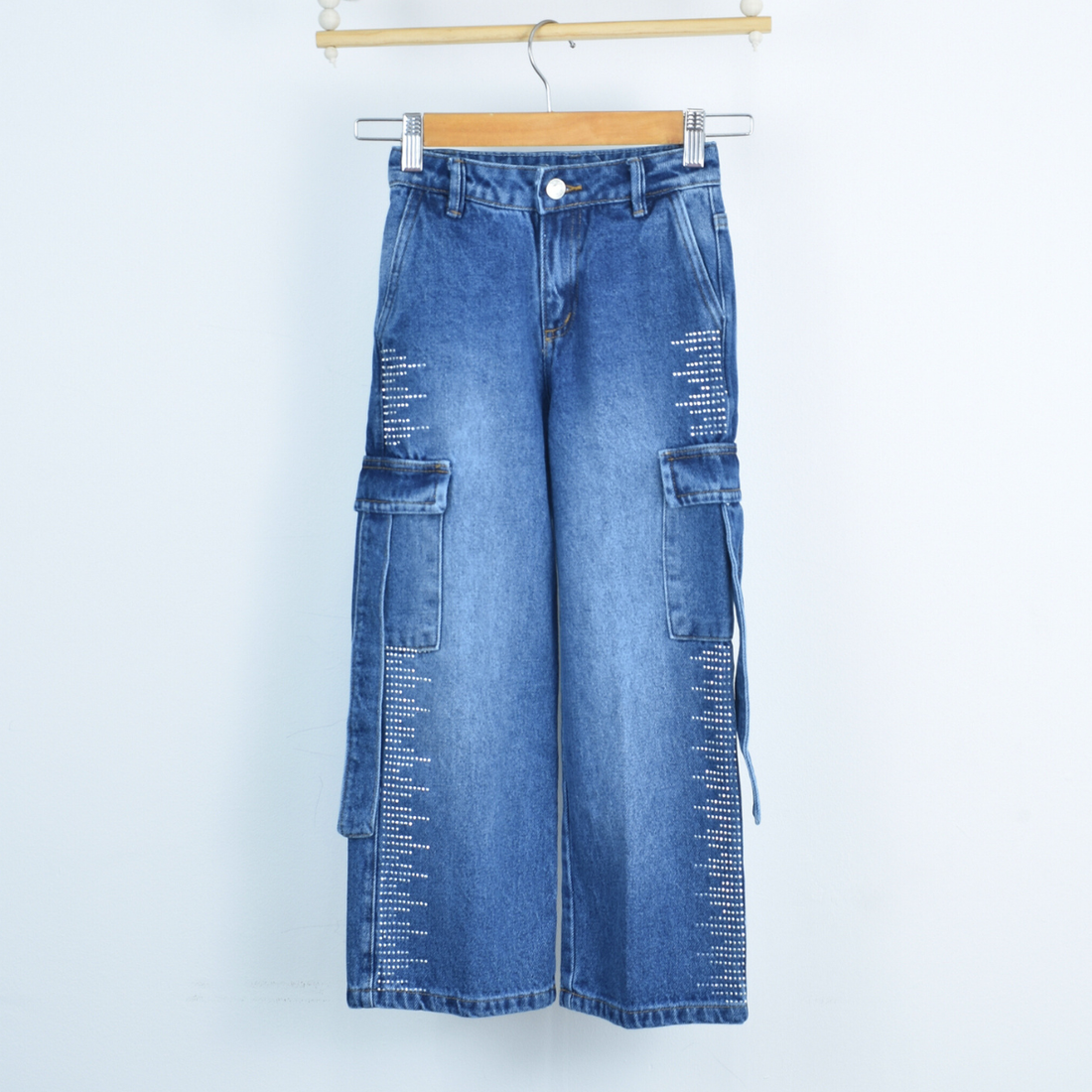 Jean estilo cargo con diseño moderno, estrellas con brillos y a los lados deshilachadas, van...