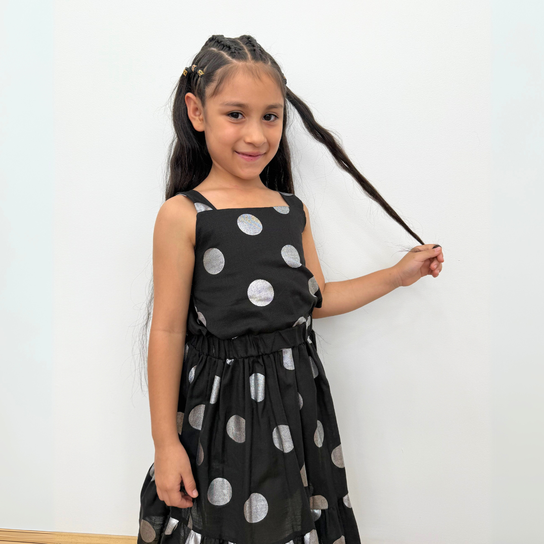 Este elegante conjunto para niña combina un top corto de tirantes delgados ajustables con un...