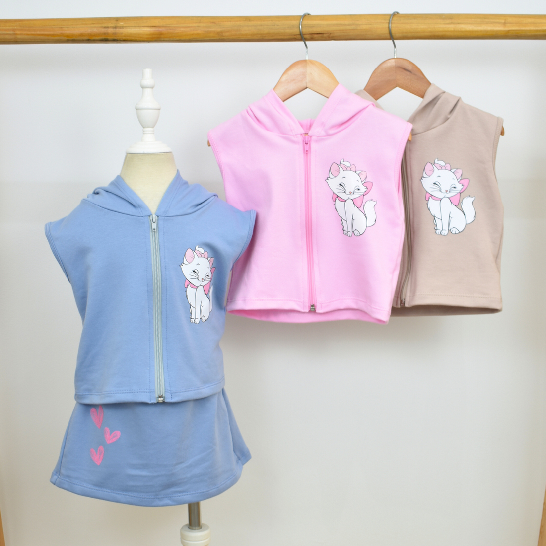 Tierno y cómodo conjunto para niña, compuesto por chaleco con capucha, cierre frontal y estampado...