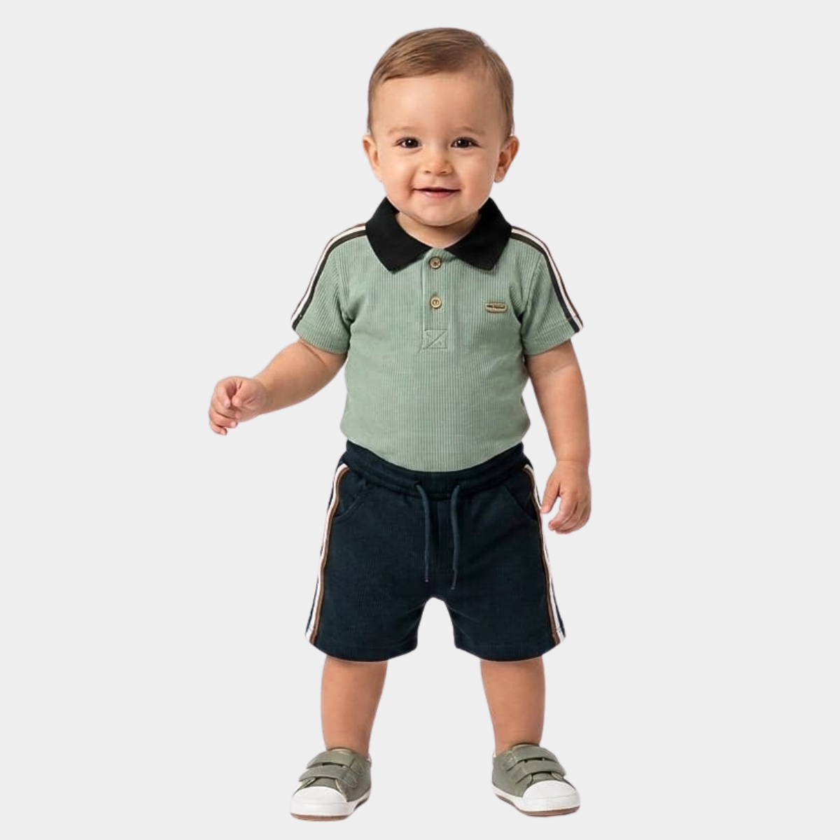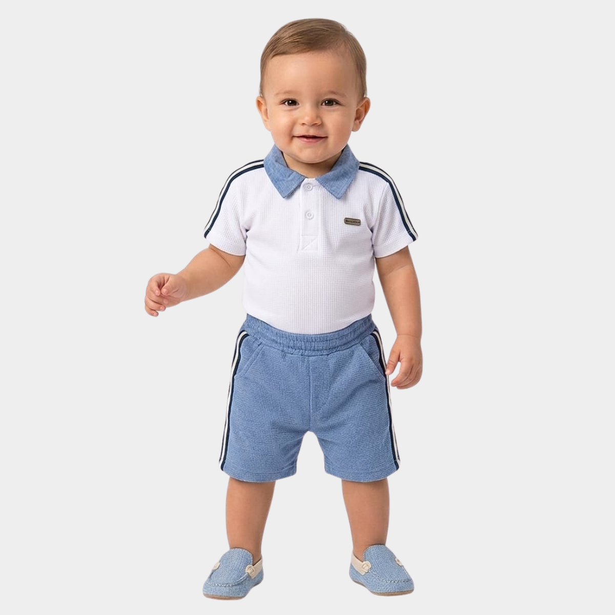 Este conjunto infantil de estilo "sport-chic" combina una camisa tipo polo con cuello, junto a un short de cintura elástica. Ambas piezas destacan por sus franjas laterales deportivas en contraste, ofreciendo un look fresco, cómodo y moderno, ideal tanto para el juego diario como para eventos casuales.
