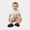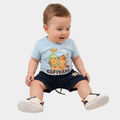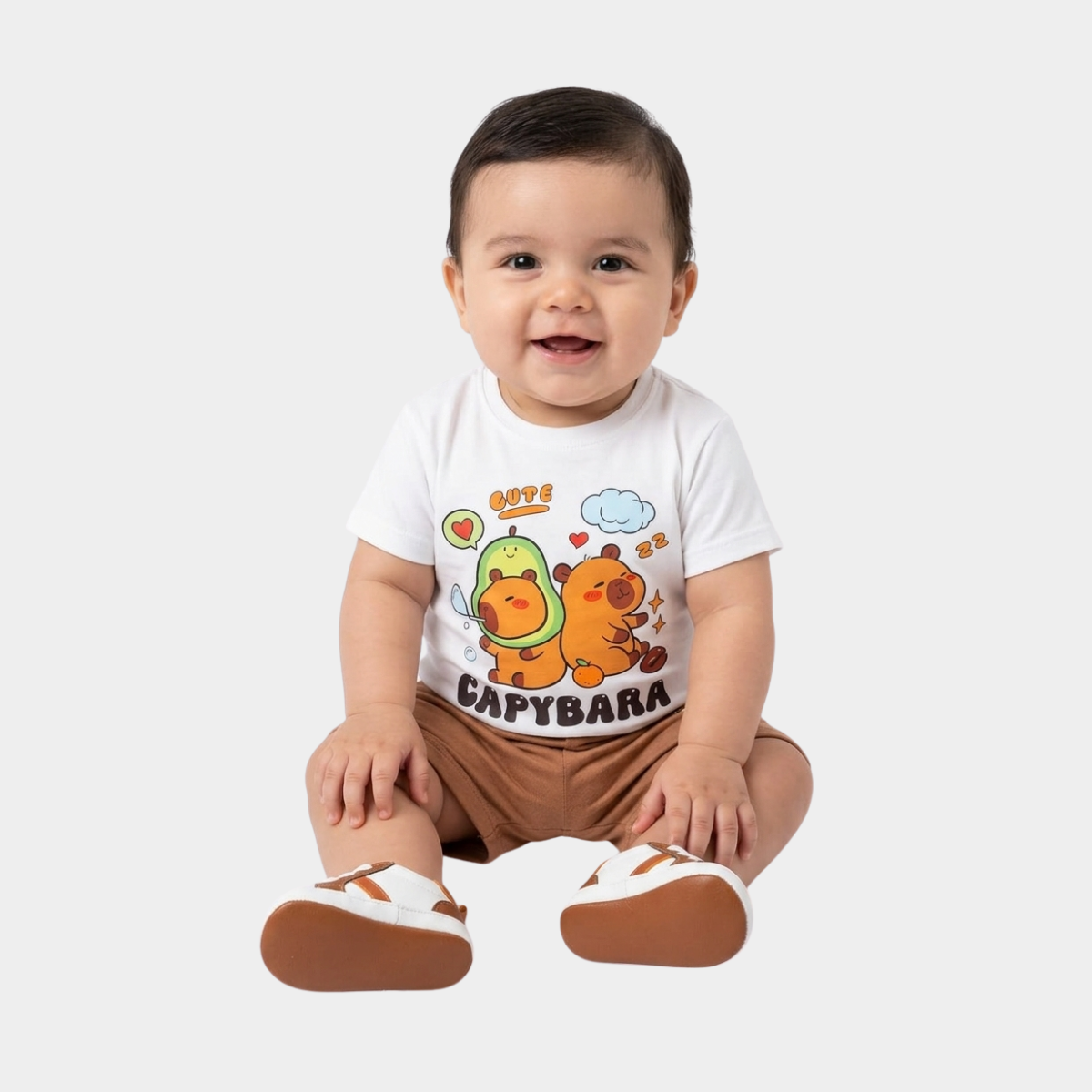 Este encantador conjunto está compuesto por una camiseta de cuello redondo con un divertido estampado de capibaras, lo que le aporta un toque alegre y juguetón. Se complementa perfectamente con una bermuda, logrando un equilibrio ideal entre comodidad y diseño para el uso diario.