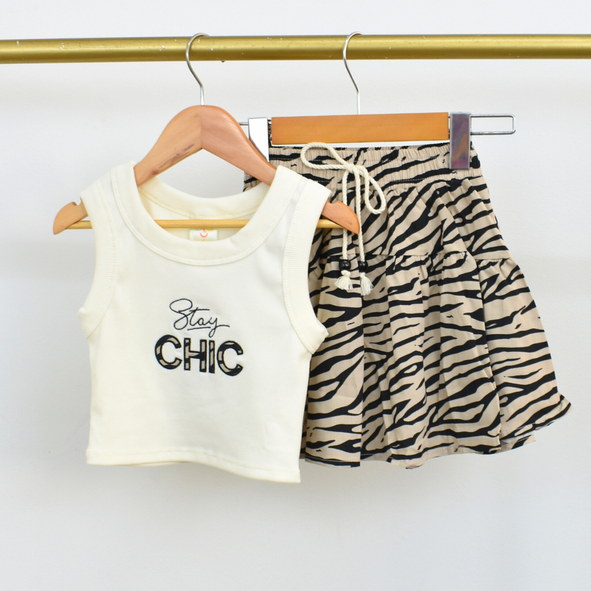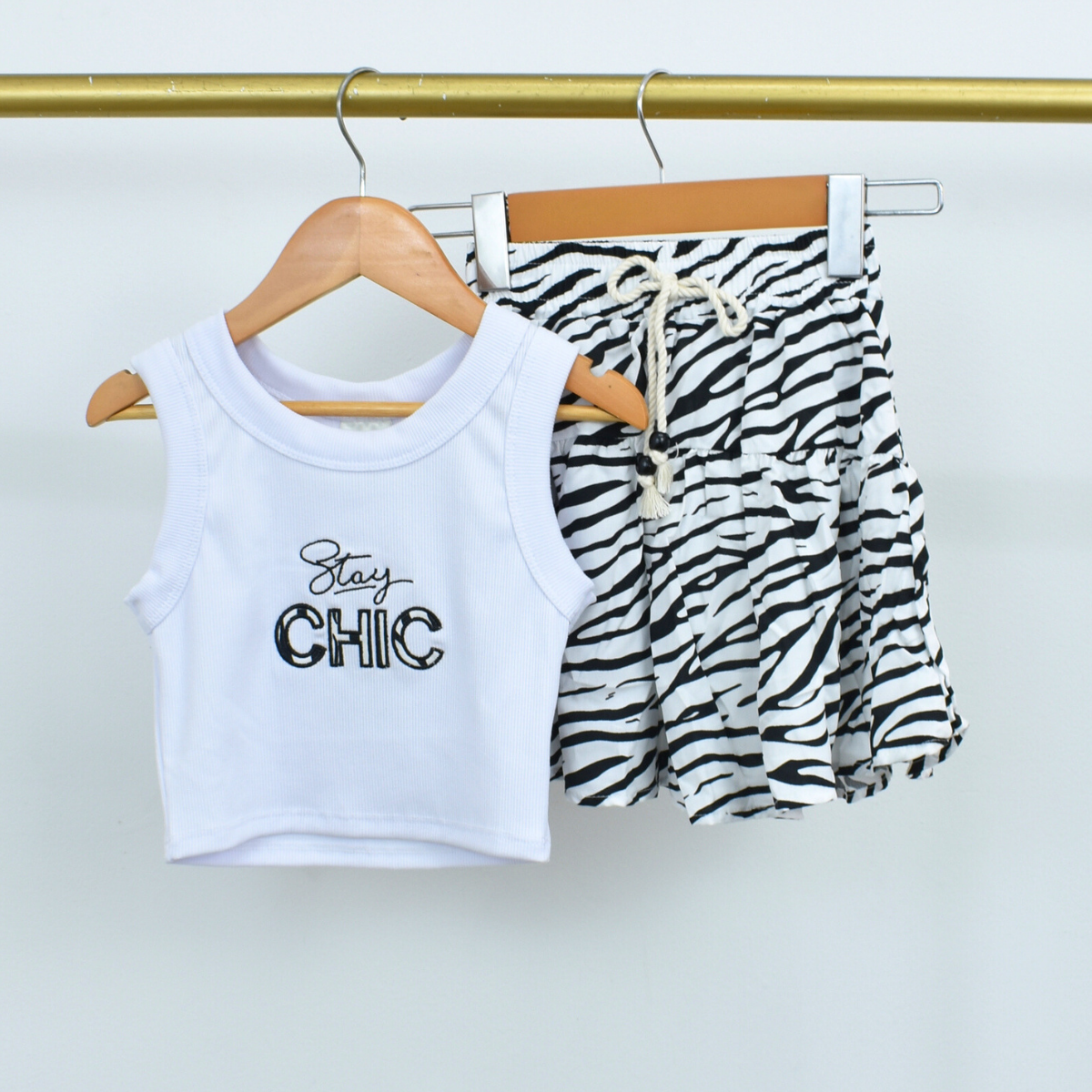 Conjunto de blusa y falda, su blusa en tela rib, manga sisa y con el estampado con la frase "Stay Chic" en un llamativo estampado de cebra, combinadas con falda corta con un patrón de rayas de cebra, ofreciendo un estilo moderno con un toque salvaje y divertido.