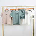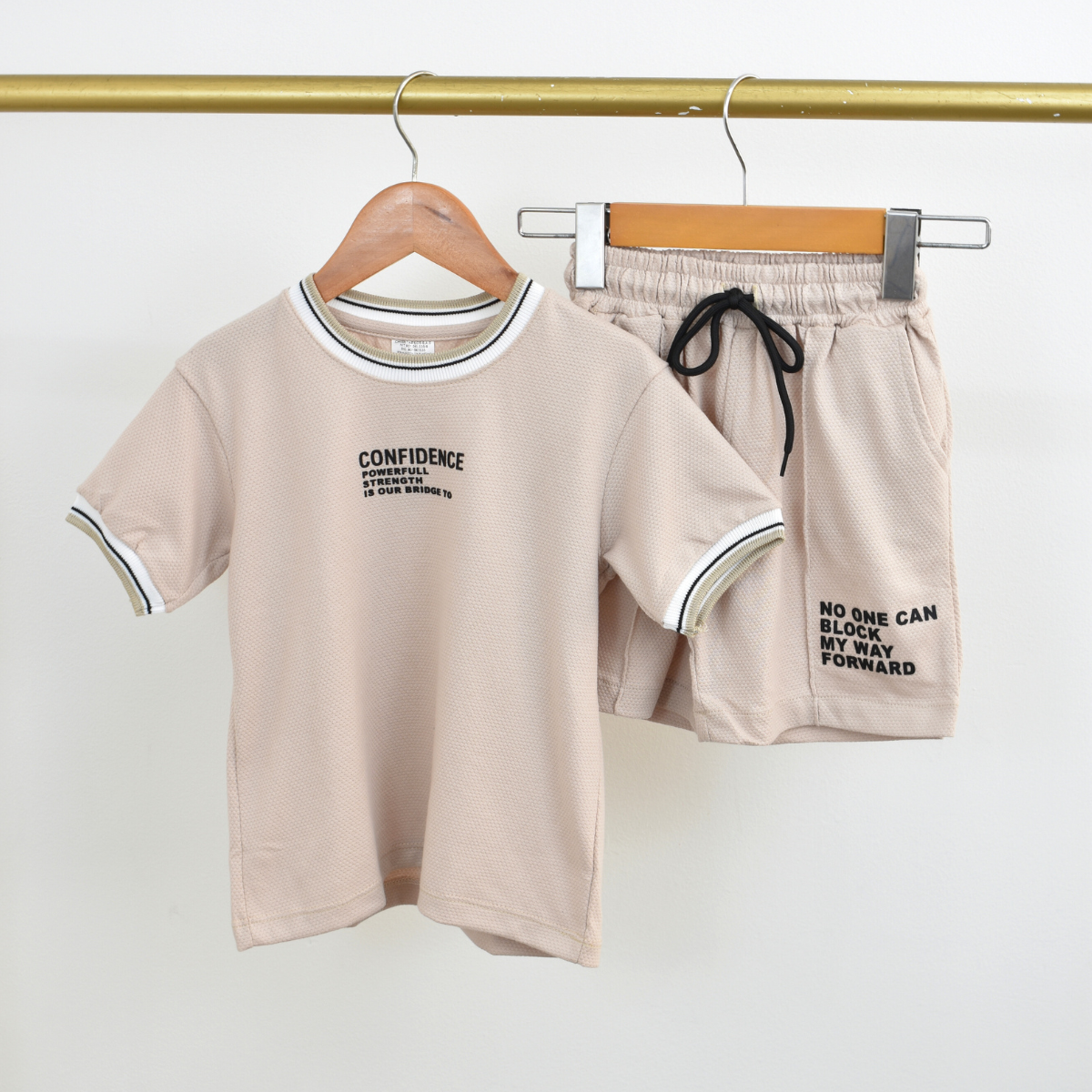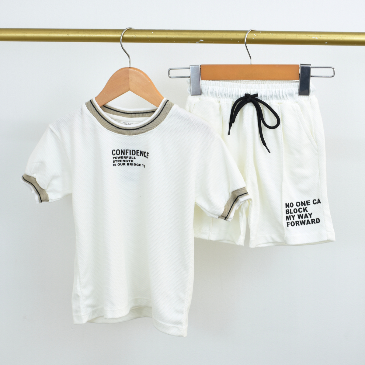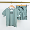Este conjunto incluye una camiseta de manga de un tejido de punto ligero y transpirable, con un estampado de texto en el pecho y ribete en el cuello y las mangas. Se combina con una bermuda corta del mismo color con elástico en la cintura y cordones.