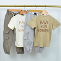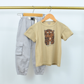 Este es un conjunto de dos piezas de estilo casual, ideal para niños pequeños. El set incluye pantalón de estilo cargo, tienen bolsillos grandes en los laterales y están hechos de un tejido resistente. La cintura es elástica y los tobillos son ajustados, lo que permite un ajuste cómodo y seguro, viene con camiseta de manga corta con un diseño de tigre en el frente. El tejido tiene una textura acanalada.