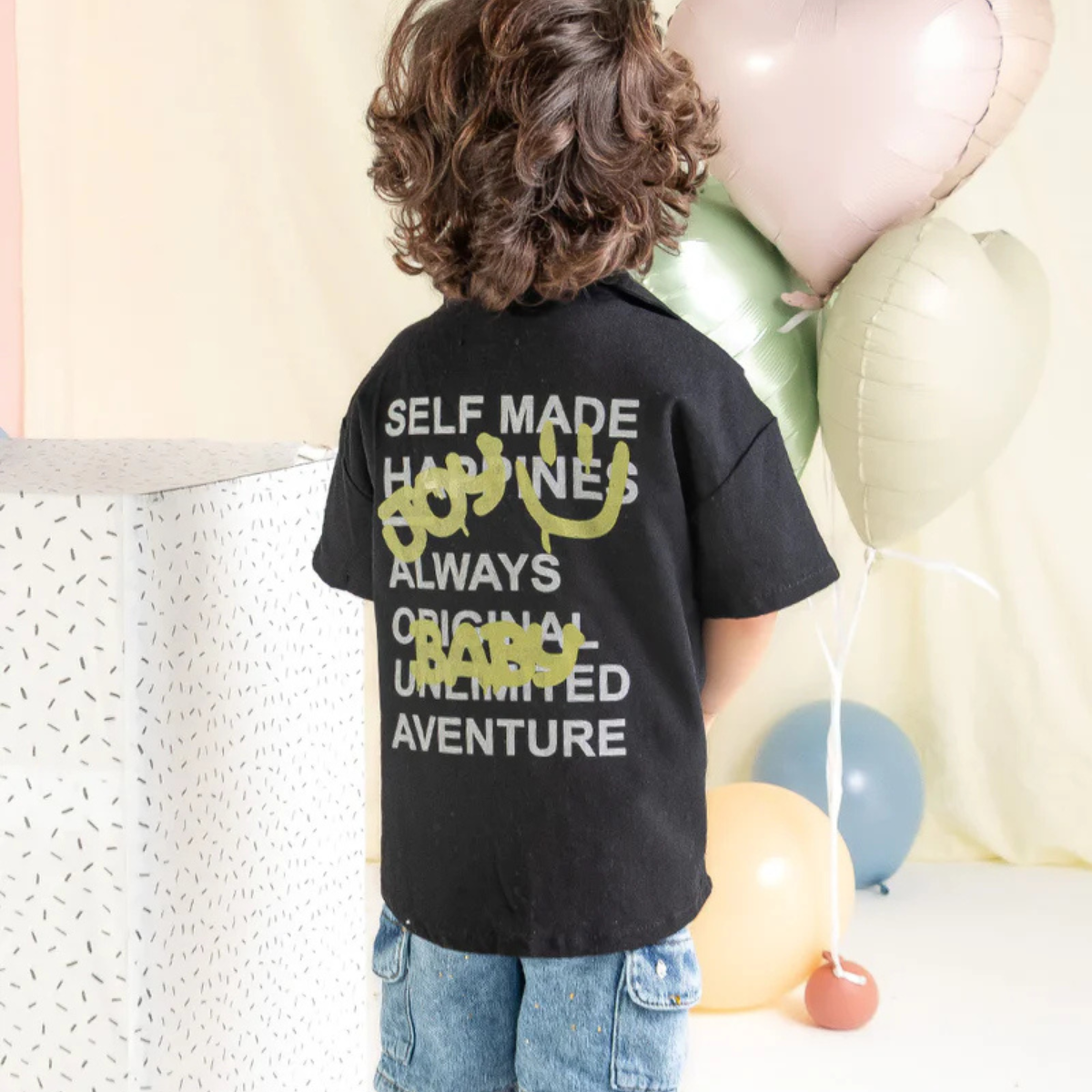 Este conjunto de tres piezas viene con bermuda fabricada en denim ligero con un cordón ajustable en la cintura para un ajuste perfecto, cuenta con un bolsillo lateral tipo cargo, camisa de botones confeccionada en tela ligera y una sobre camiseta estampada para un look casual.