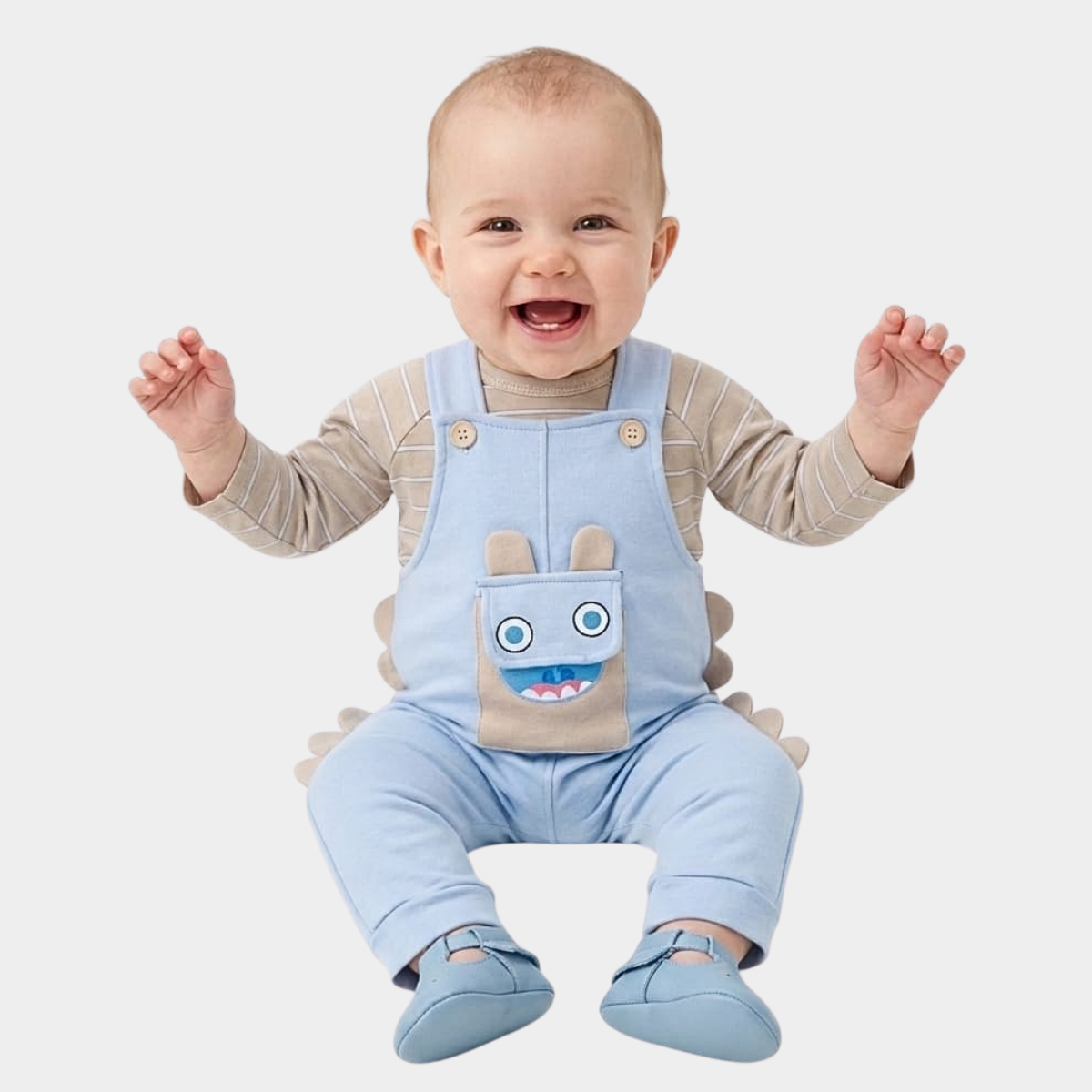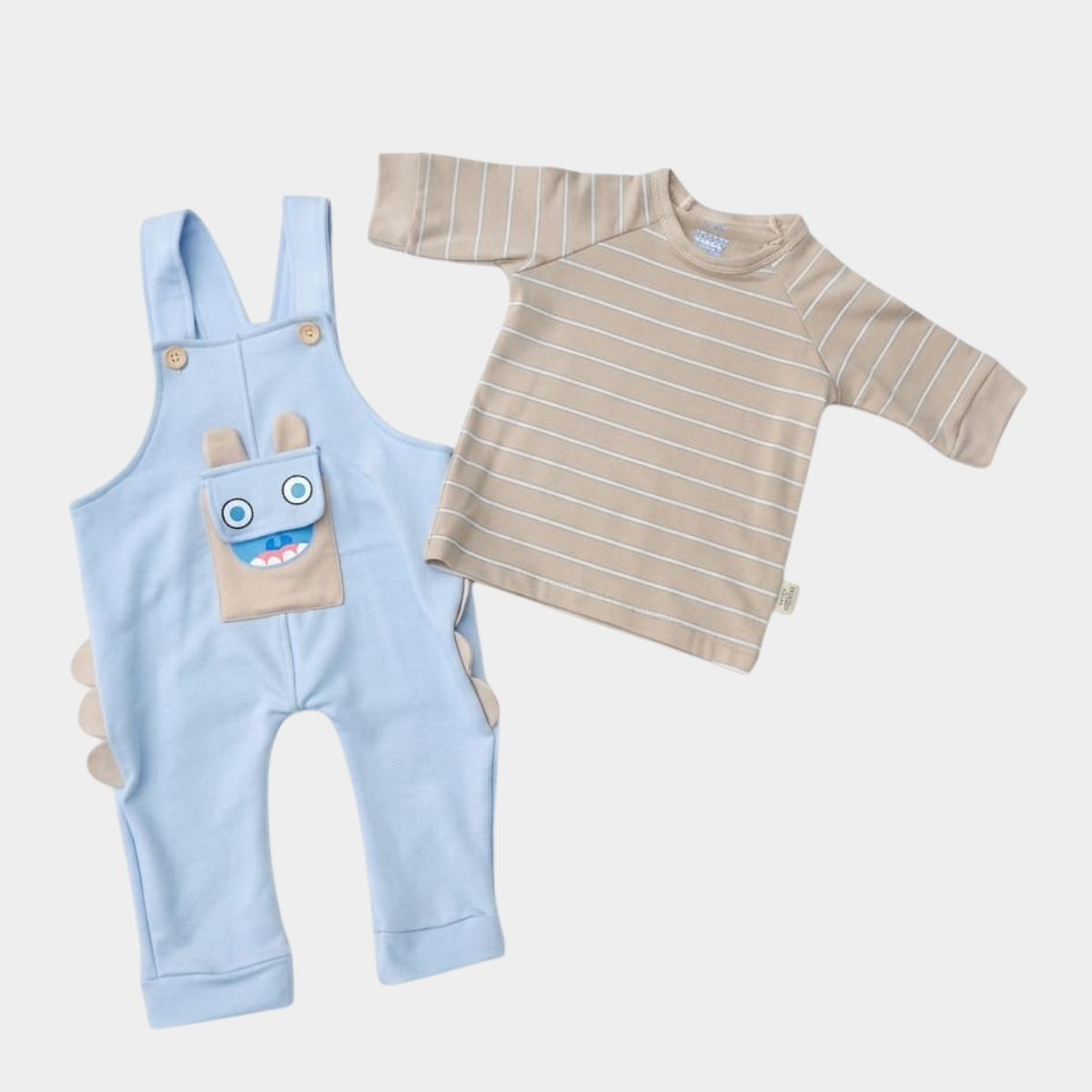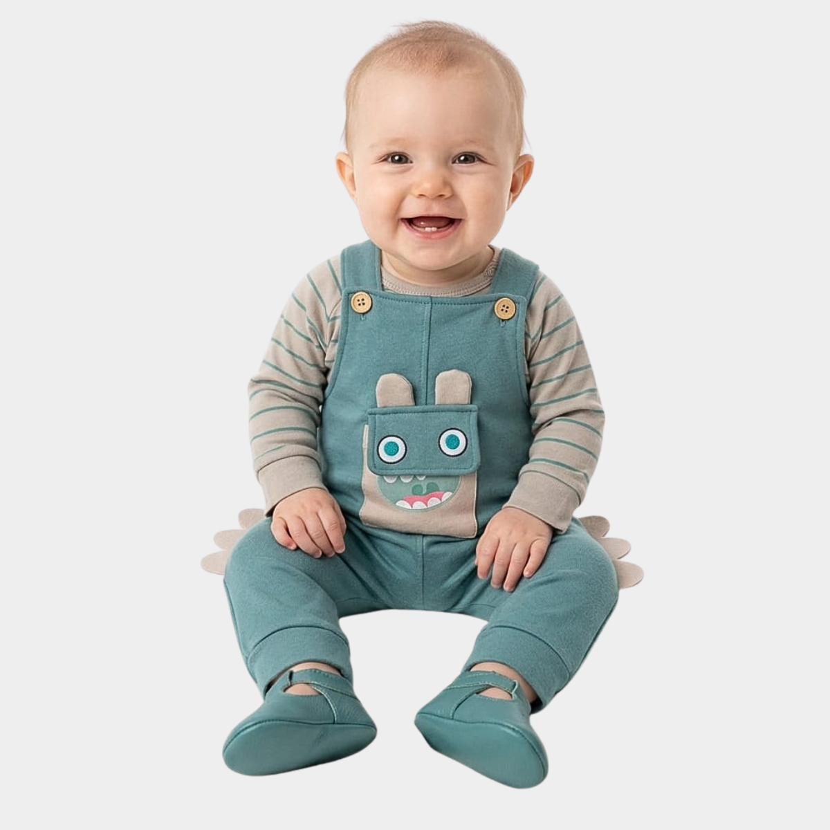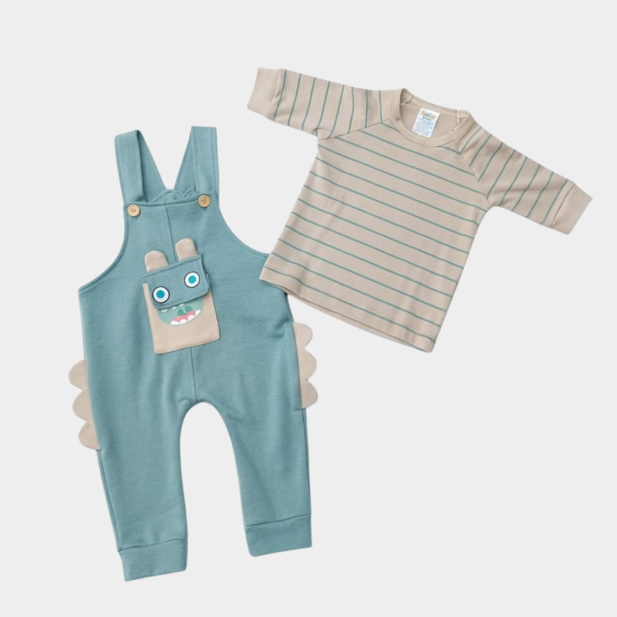 Este encantador conjunto infantil de dos piezas combina comodidad y estilo lúdico para los más pequeños. Incluye un buso de manga larga con un clásico estampado de rayas horizontales y un overol tipo jardinera, el cual destaca por su divertido bolsillo frontal con diseño de monstruito y detalles laterales en relieve que simulan crestas.