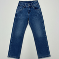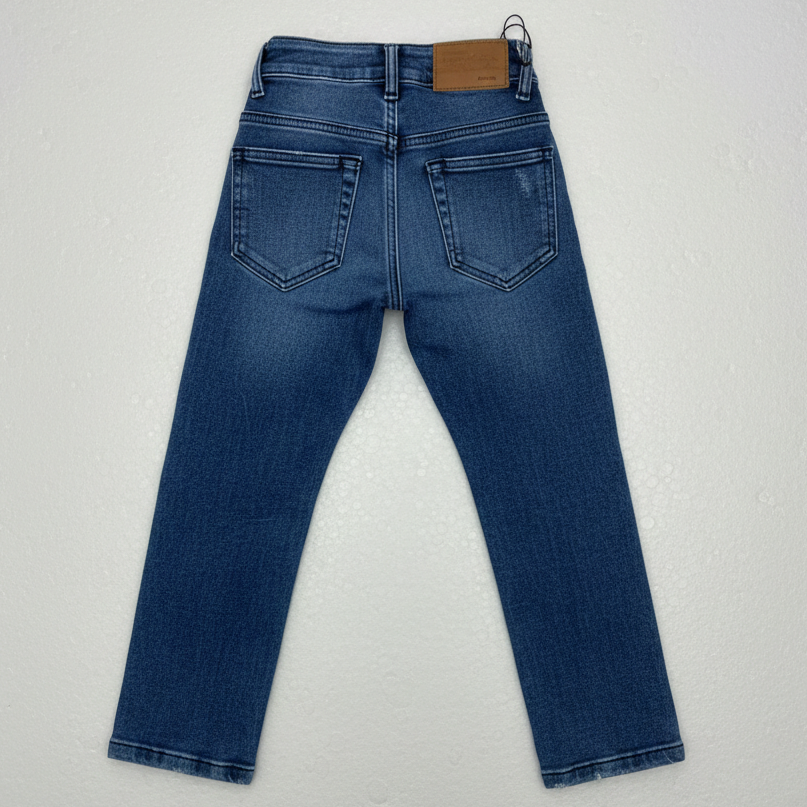 Estos jeans presentan un corte recto clásico y un acabado con ligeros desgastes frontales que aportan un toque moderno y versátil. Confeccionados con materiales resistentes de alta calidad, cuentan con un diseño funcional de bolsillos y un cierre de botón reforzado, ideales para asegurar comodidad y durabilidad en el uso diario de los más pequeños.