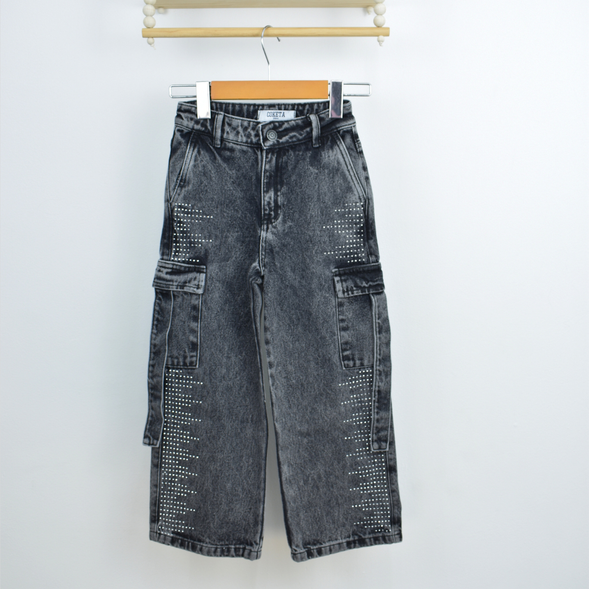 Jean estilo cargo con diseño moderno incluye bolsillos laterales con correas de adornos y trae piedreria a los laterales. La silueta es wide leg (Pierna ancha) trae bolsillos delanteros y traseros de utilidad.