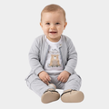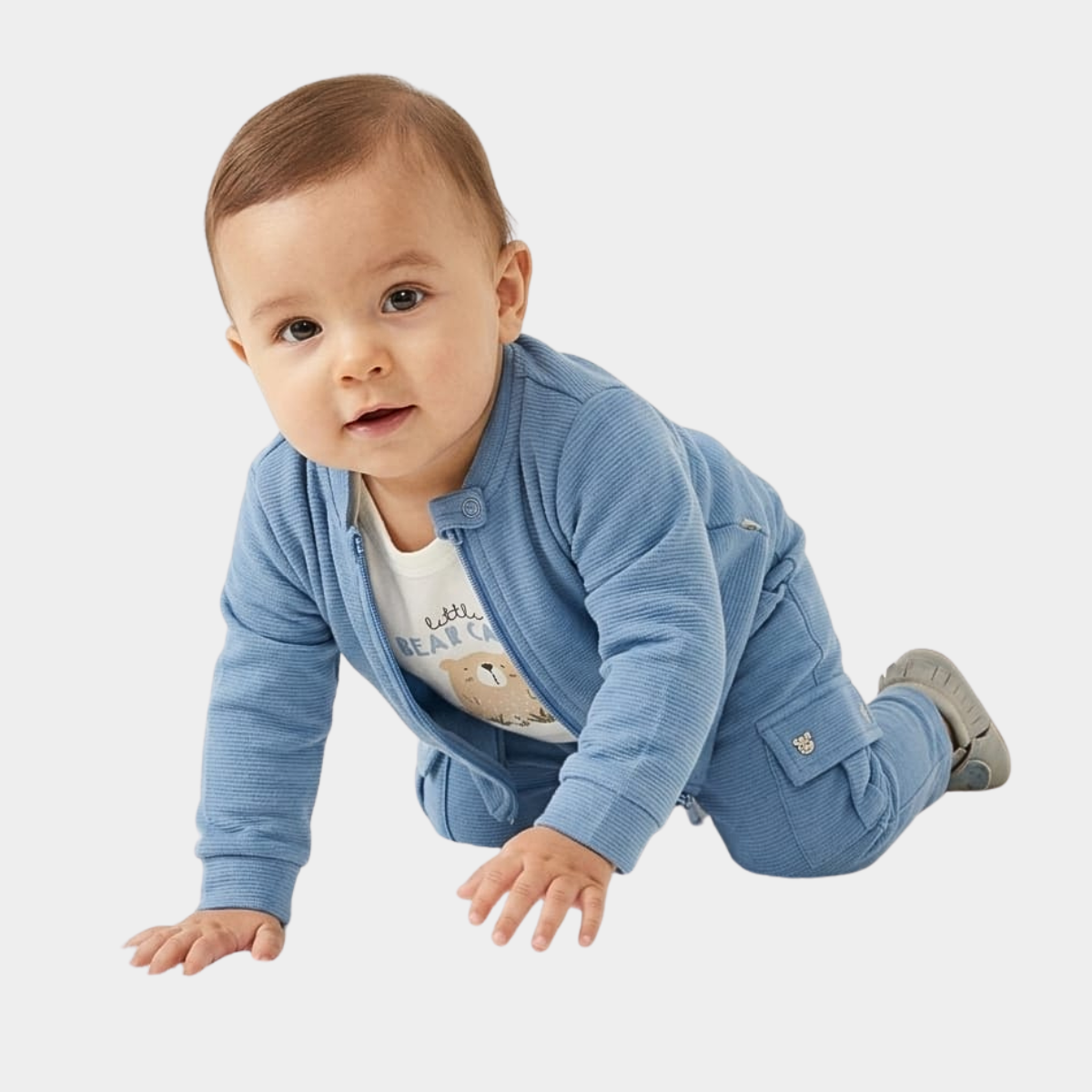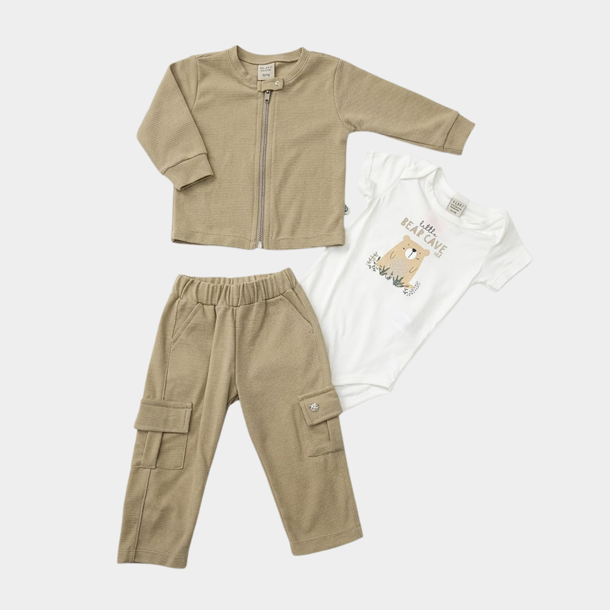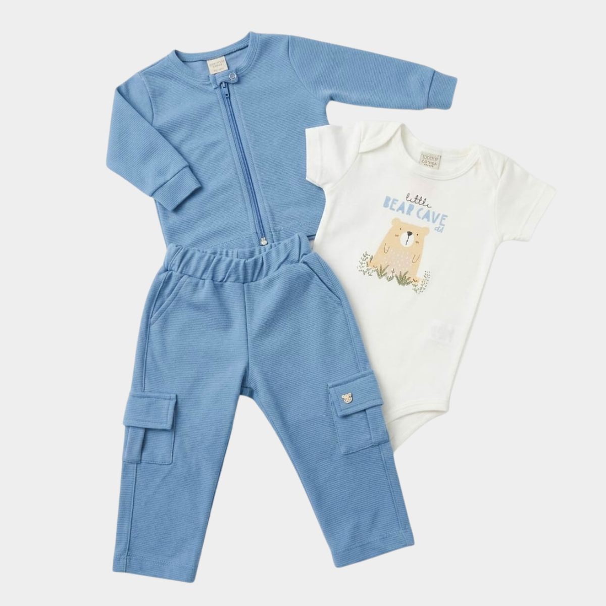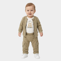 Este práctico conjunto de tres piezas para bebé está diseñado para ofrecer máxima calidez y confort durante sus primeras aventuras. Incluye una chaqueta de cierre frontal con cremallera y cuello, un pantalón estilo cargo con bolsillos laterales y un body interno decorado con un tierno motivo de oso.