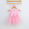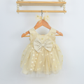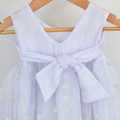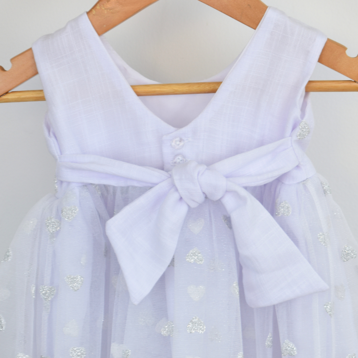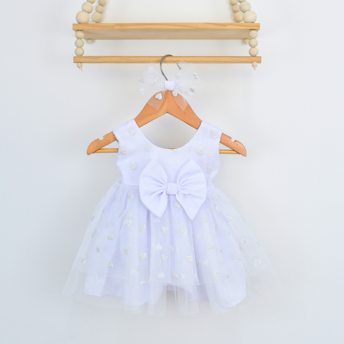 Este delicado vestido es la elección perfecta para celebraciones. Su diseño superior liso con un moño decorativo en la parte frontal. falda voluminosa con una capa de tul con estampado escarchado en relieve, lazo y botones en su espalda para su ajuste. Incluye una pinza en del tono para el cabello.