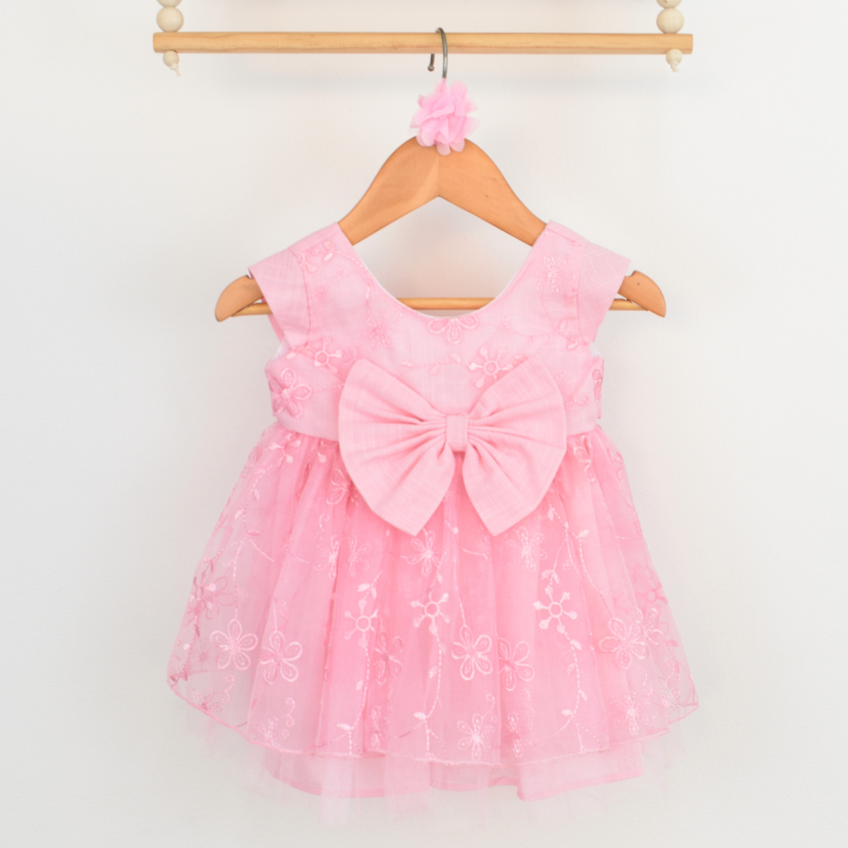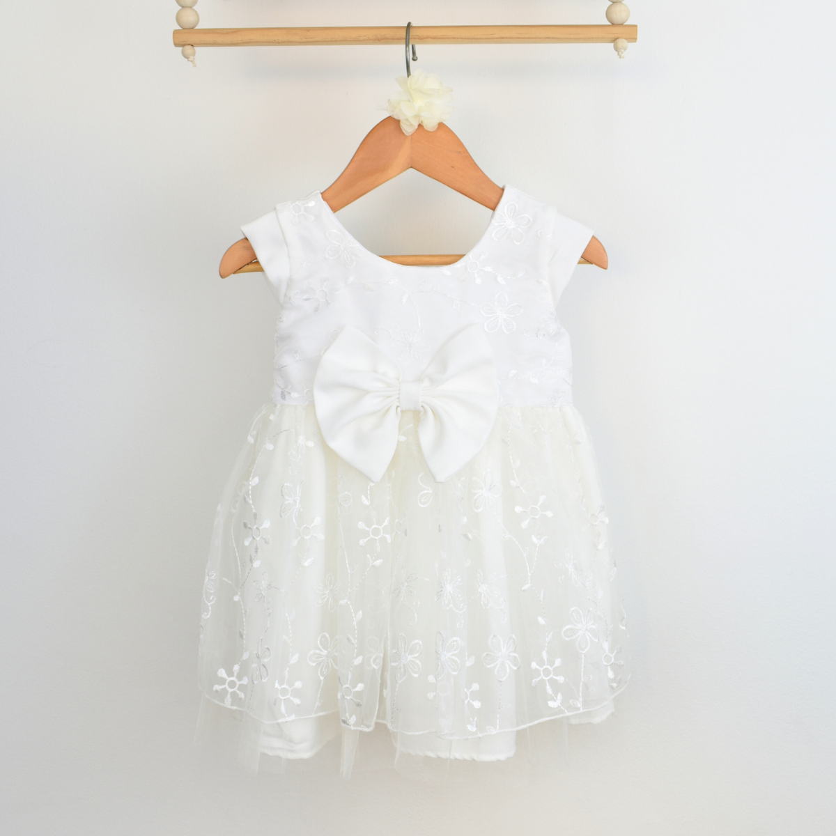 Este vestido es la elección perfecta para cualquier ocasión especial. Confeccionado en una suave tela de tul y forro, presenta un hermoso bordado floral tono sobre tono, acompaña un moño grande en su parte frontal, y cinta de amarre en su espalada, la cual también tiene un corte en v en su espalada . incluye una pinza del tono del vestido.
