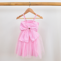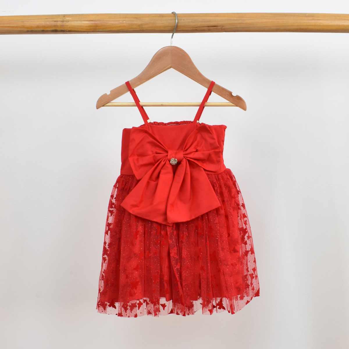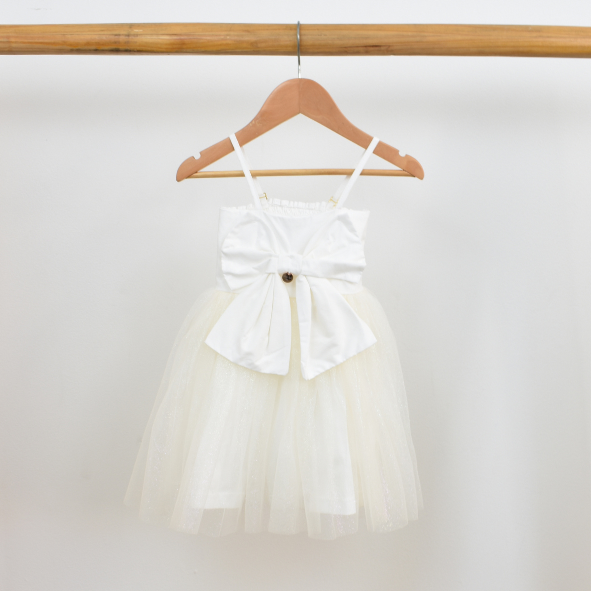 Precioso vestido de tirantes con cuerpo fruncido de resorte y un gran lazo frontal decorativo. La falda de doble capa, la exterior de tul brillante, con textura o estampado.