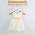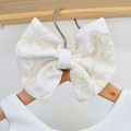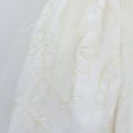 Este vestido, en tono blanco marfil, nos presenta un diseño con un hermoso faldón que combina una capa de tul con una tela interior adornada con un sutil y sofisticado bordado dorado. Un detalle encantador es el cinturón, compuesto por delicadas flores en tonos durazno, atrás nos permite un moño que resalta para un ajuste, mientras que el conjunto se completa a la perfección con un gran moño a juego para el cabello, hecho del mismo tejido bordado del faldón.