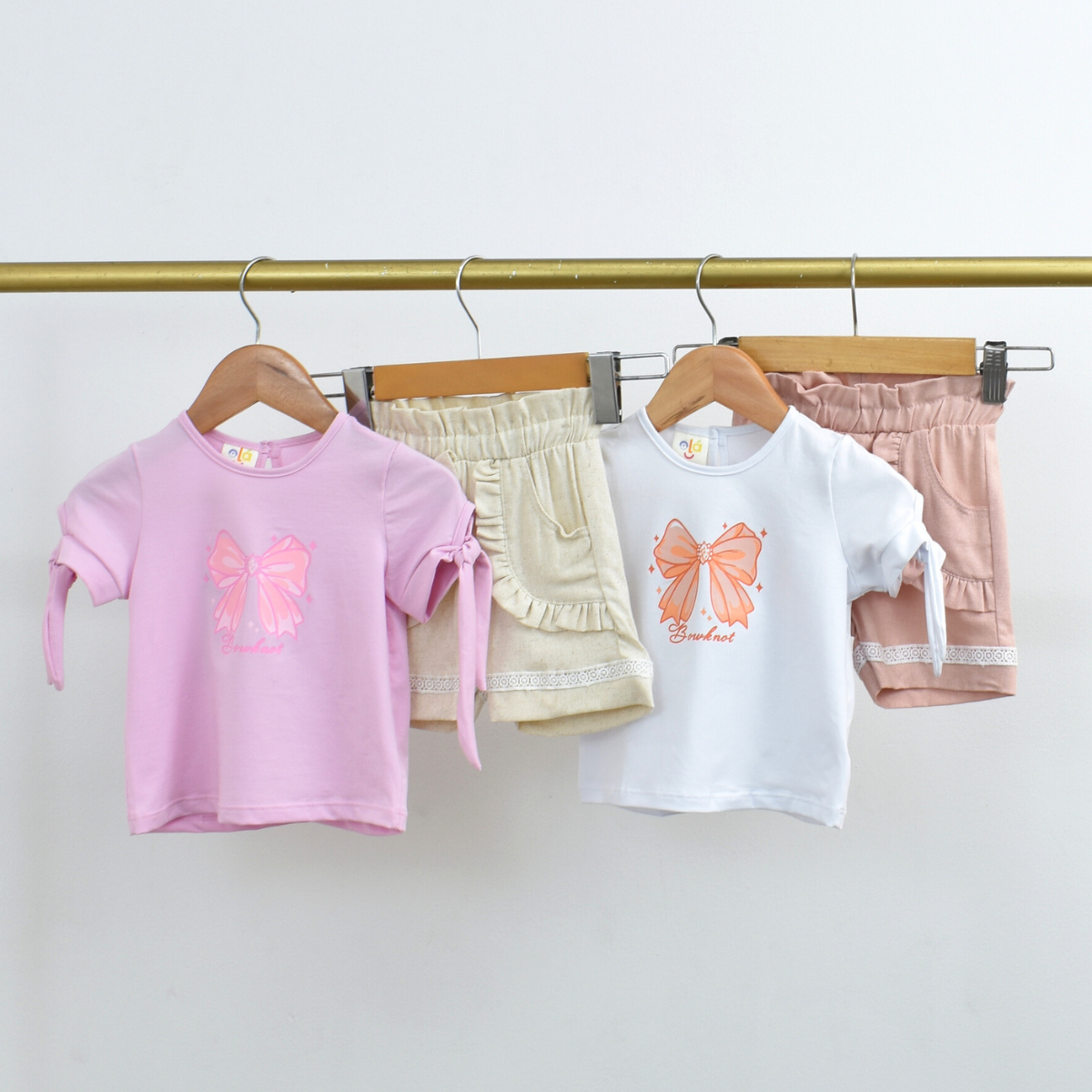 Este conjunto de dos piezas combina la suavidad de una camiseta de algodón con detalles únicos de lazos anudados en las mangas y un delicado estampado frontal de moño. El diseño se complementa con un short de estilo rústico que destaca por su cintura elástica, bolsillos laterales adornados con románticos boleros y un sutil borde de encaje en el ruedo.