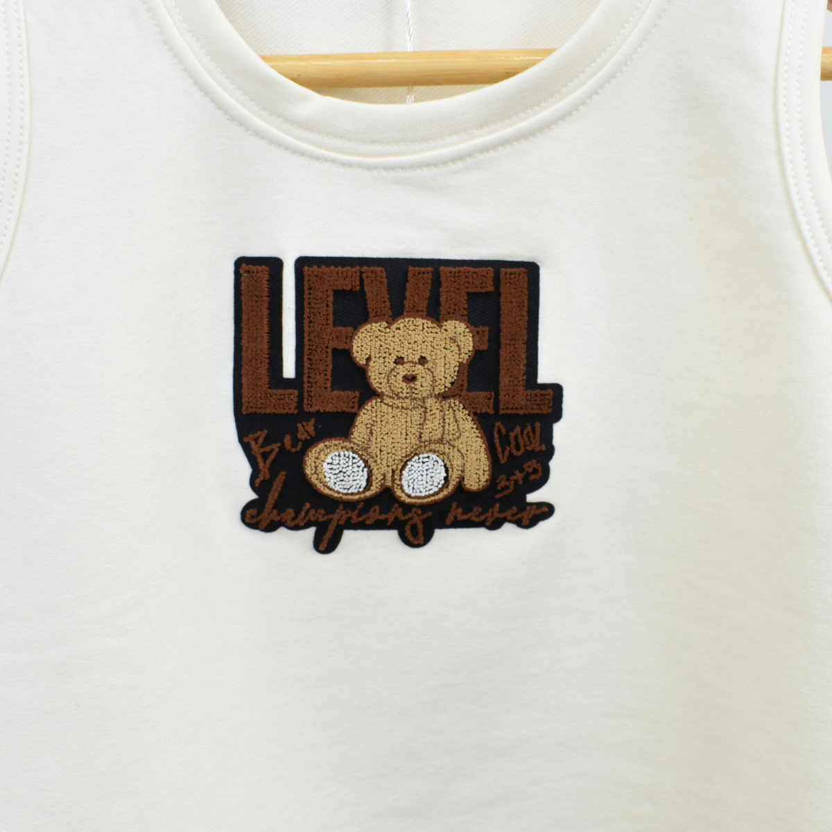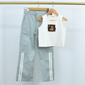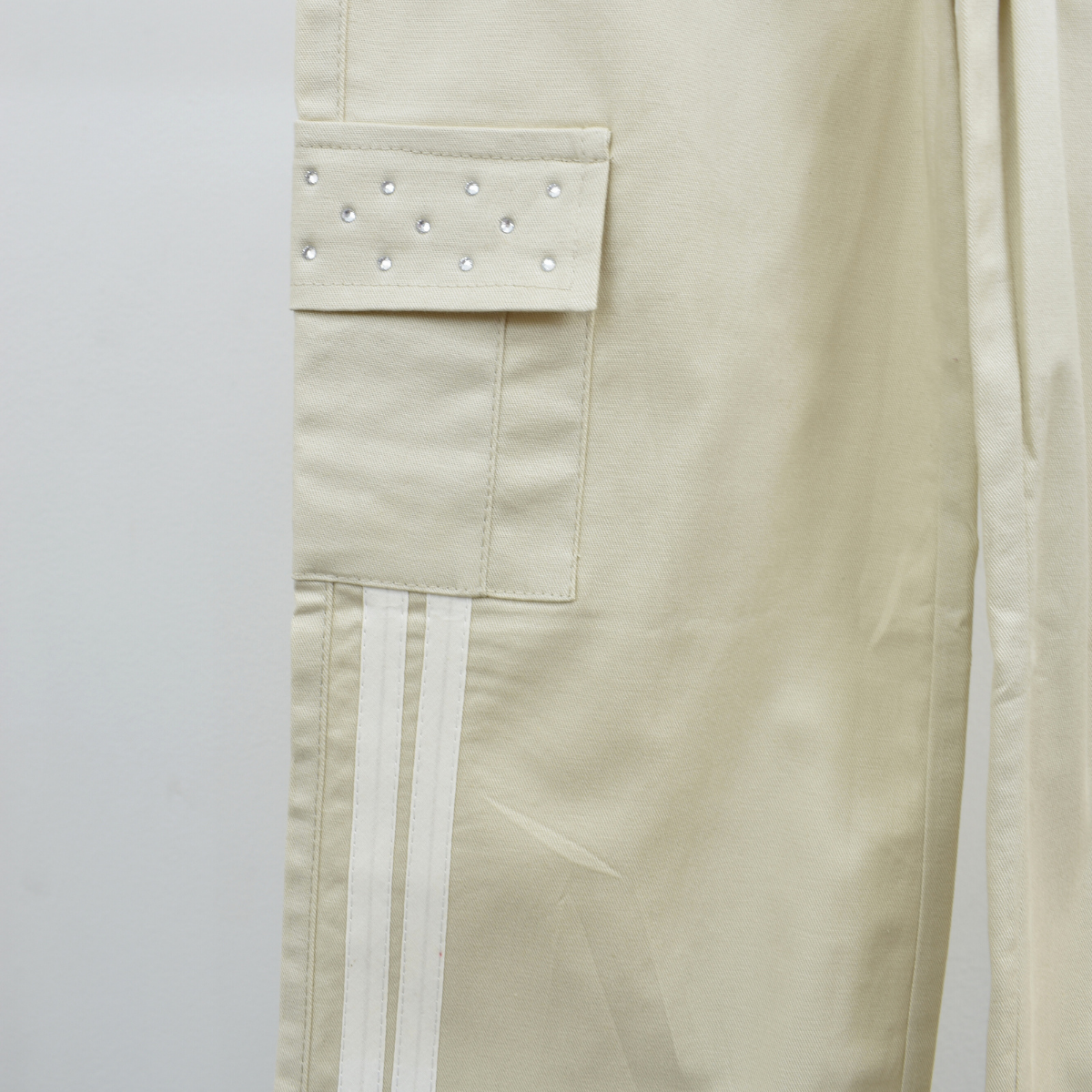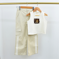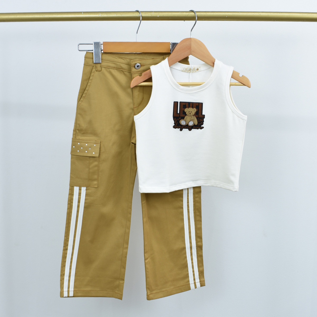 Conjunto de pantalón cargo en drill, corte ancho combinan funcionalidad, con bolsillos cargo laterales adornados con sutiles aplicaciones de pedrería brillantes. Una franja deportiva en color blanco recorre el lateral de la pierna, el conjunto se completa con una blusa de manga sisa blanca con un estampado de osito.