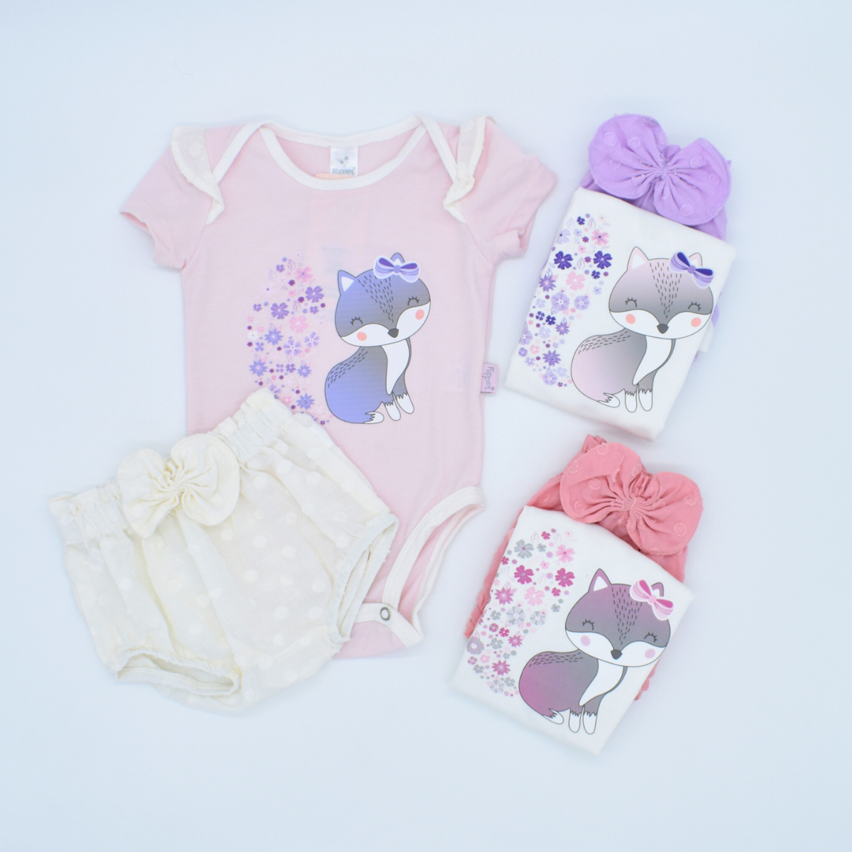 Este conjunto presenta un body de manga corta con un estampado de zorrita, detalles de mini boleros en los hombros y broches inferiores para un cambio práctico, acompañado de un cubre pañal con textura de puntos y un delicado lazo frontal, todo confeccionado en tejidos suaves y transpirables para cuidar la piel del bebé.