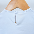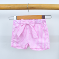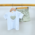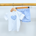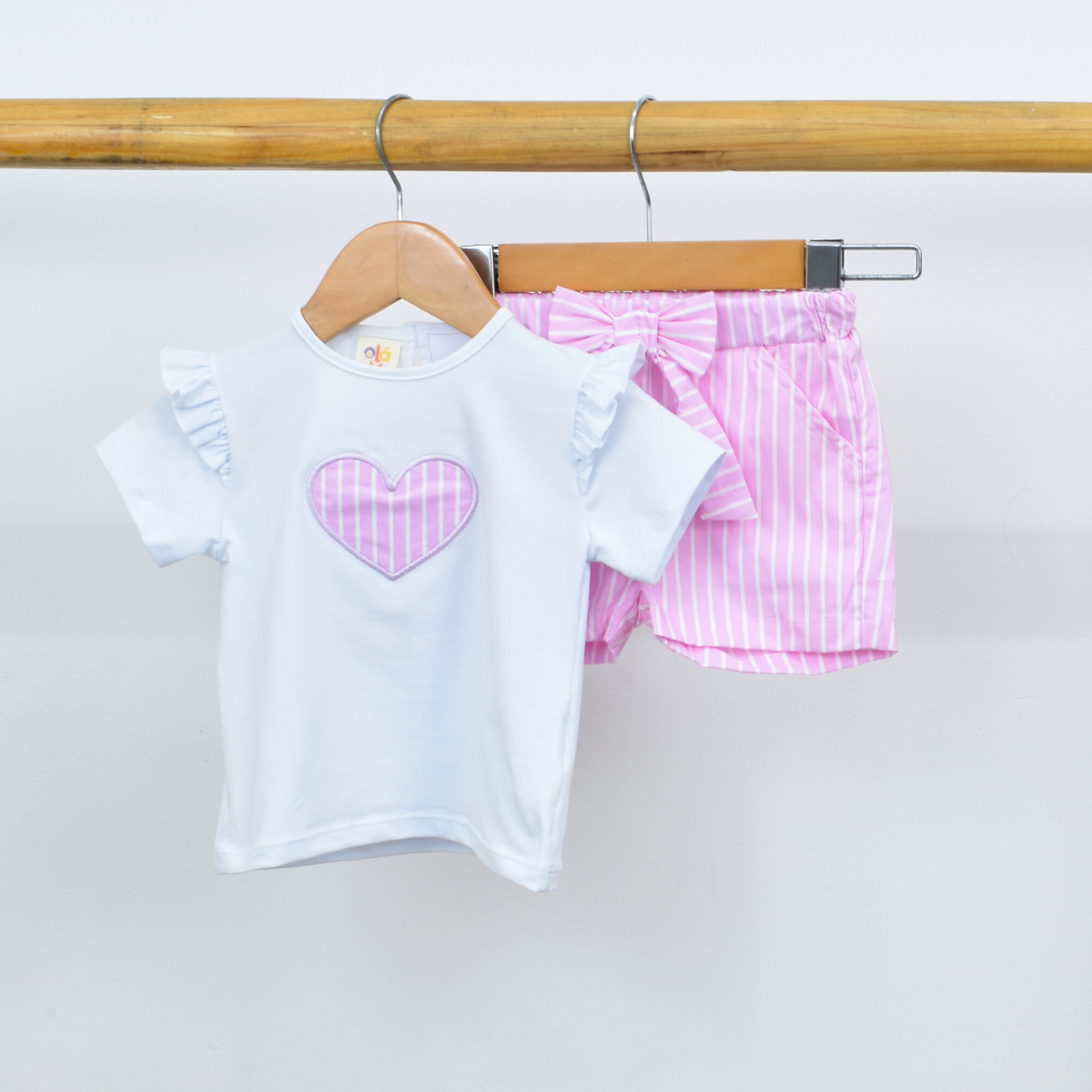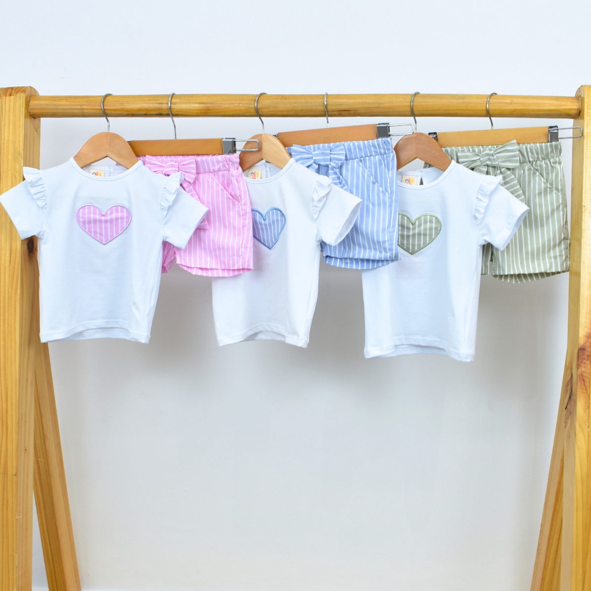 Nuestros adorables conjuntos son perfectos para el día a día, incluye una camiseta blanca de manga corta con sutiles boleros en los hombros, adornada con un llamativo corazón de color de su short en el centro y botón en su parte de atrás para su ajuste. Se complementan con unos shorts de cintura elástica, disponible en tres colores a rayas, adorna su cintura con un moño y bolsillos útiles.