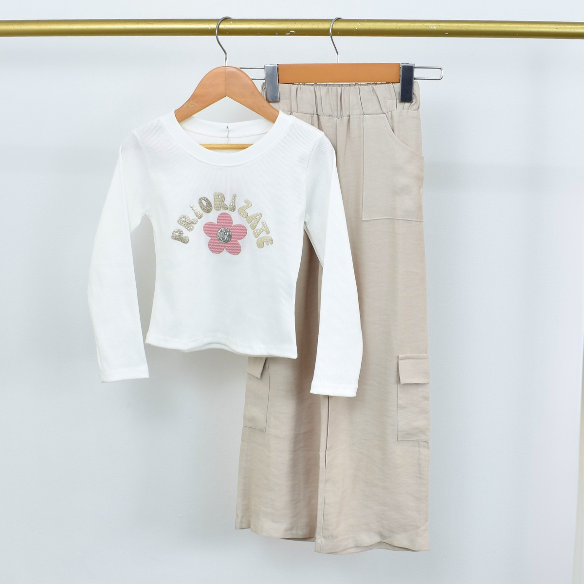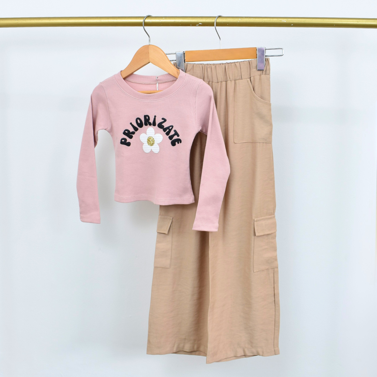 Este conjunto de dos piezas es la combinación perfecta de estilo. La blusa de manga larga, con la palabra "Priorízate" en relieve y un delicado detalle de flor. El pantalón, con sus prácticos bolsillos laterales, tiene una silueta fluida y cómoda.