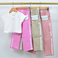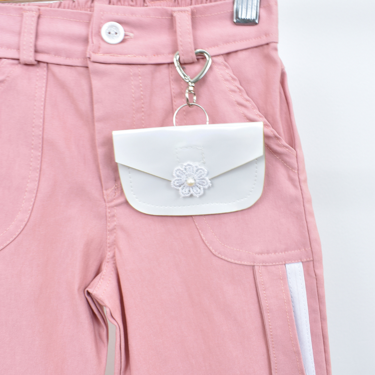 Este es un conjunto moderno y cómodo, con una camiseta blanca de manga corta con un sutil detalle de brillo en el frente que se pueden combinar. Los pantalones son de corte recto y holgado, tienen franjas decorativas blancas a los lados de las piernas y bolsillos grandes en los costados, lo que les da el característico estilo cargo. Cada uno incluye un pequeño bolso o monedero colgante sujeto con un clip en forma de corazón.