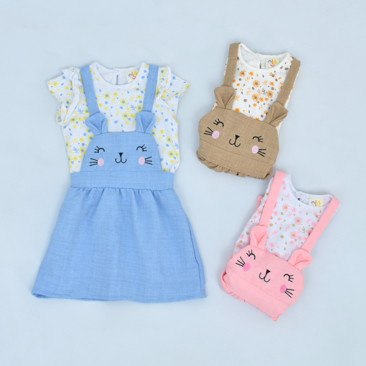 Jardinera con una camiseta de manga corta con boleros, estampado floral y un botón atrás para su ajuste. Su peto con orejitas y rostro de conejito bordado en el pecho, su cintura enrresortada y tiras cruzadas.