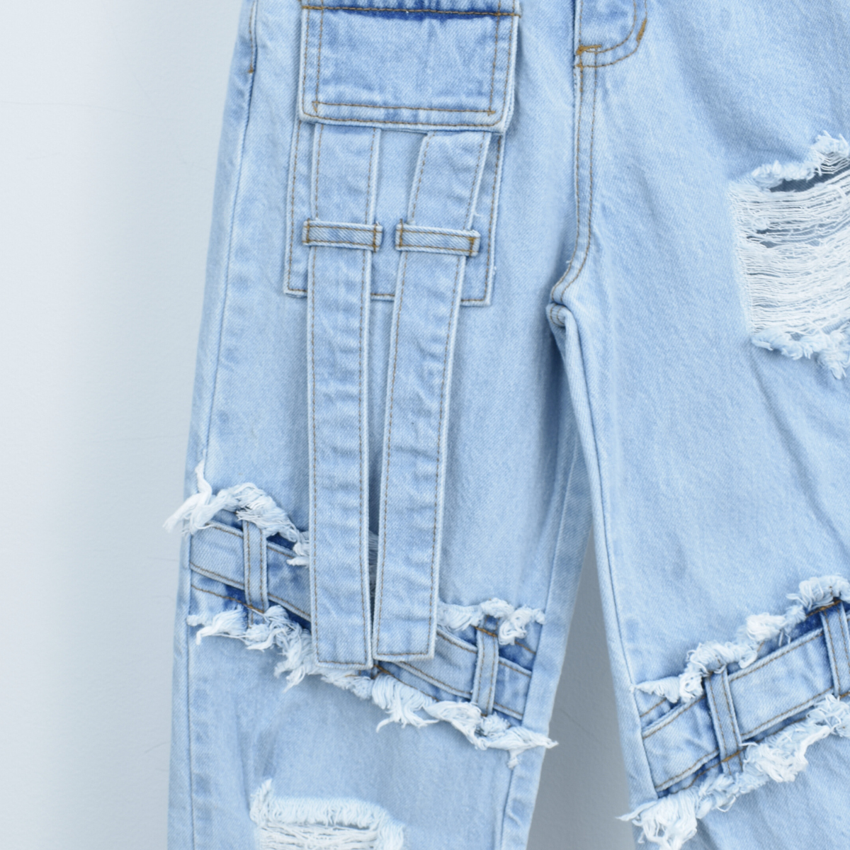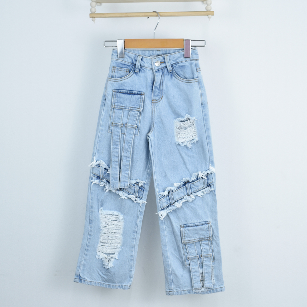 Jean estilo cargo con diseño moderno incluye bolsillos amplios, costuras marcadas como si fueran tipo correa y rotos decorativos que aportan un aire urbano y atrevido. La silueta es wide leg (Pierna ancha). Trae bolsillos traseros