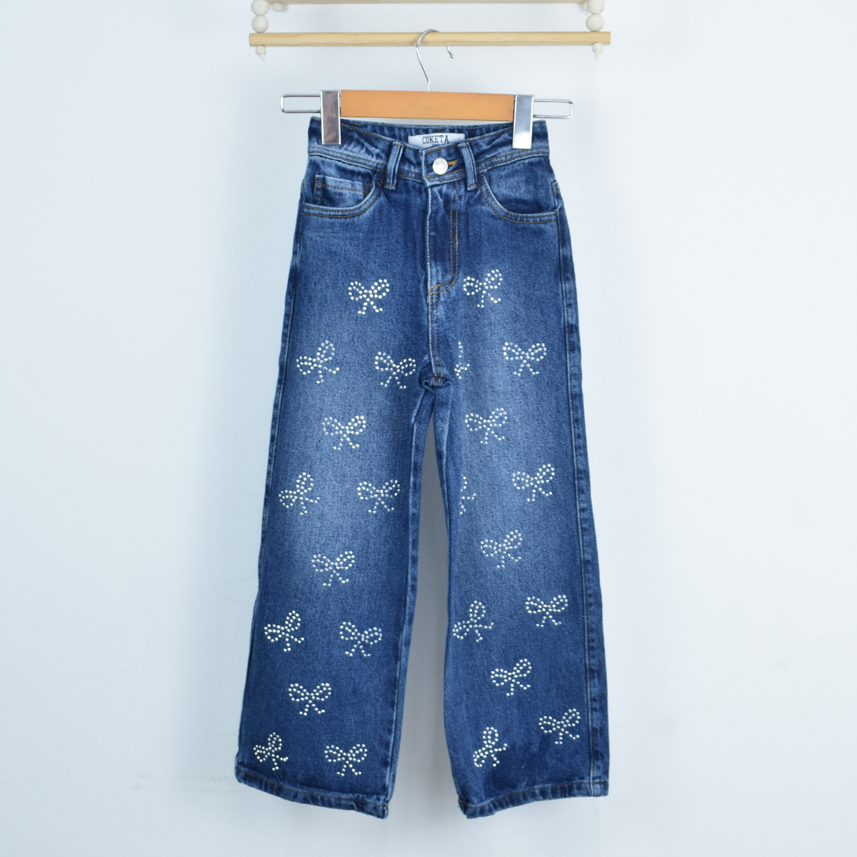 Jean en denim con un acabado suave y lavado que realza su tono clásico, su diseño es wide leg (pierna ancha) que aporta una caída recta y relajada. El toque distintivo de este jean son los moños en pedrería, trae bolsillos traseros y delanteros
