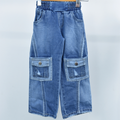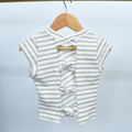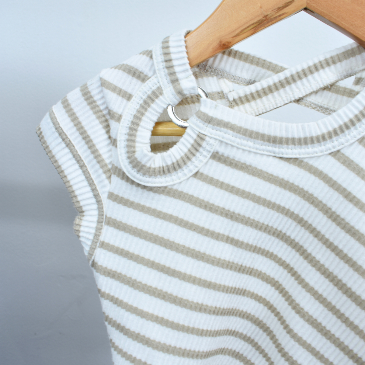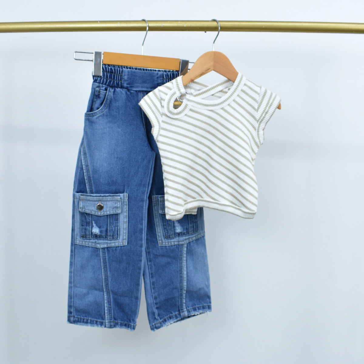 Conjunto con pantalón en denim estilo cargo y blusa en tela rib sin mangas en color blanco con finas rayas horizontales disponible en dos tonos, presentan un detalle llamativo de abertura y aro decorativo en el hombro y en su espalada unos detalles que añade un toque moderno. Se complementa con un pantalón cargo en denim de corte ancho, que destacan por su cintura fruncida y elástica para un ajuste cómodo, y sus grandes bolsillos de parche con solapa y detalles rasgados en la parte media de la pierna.