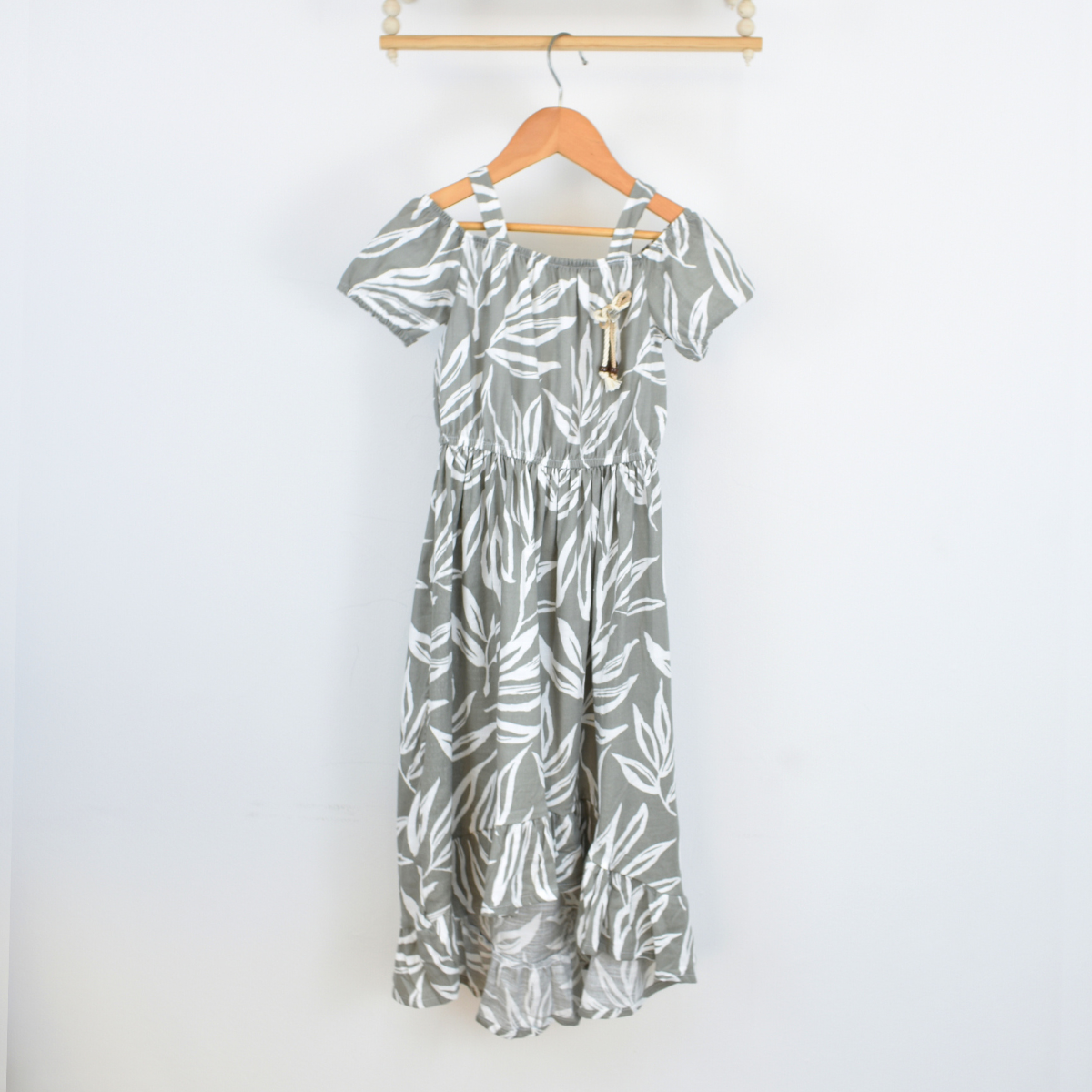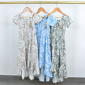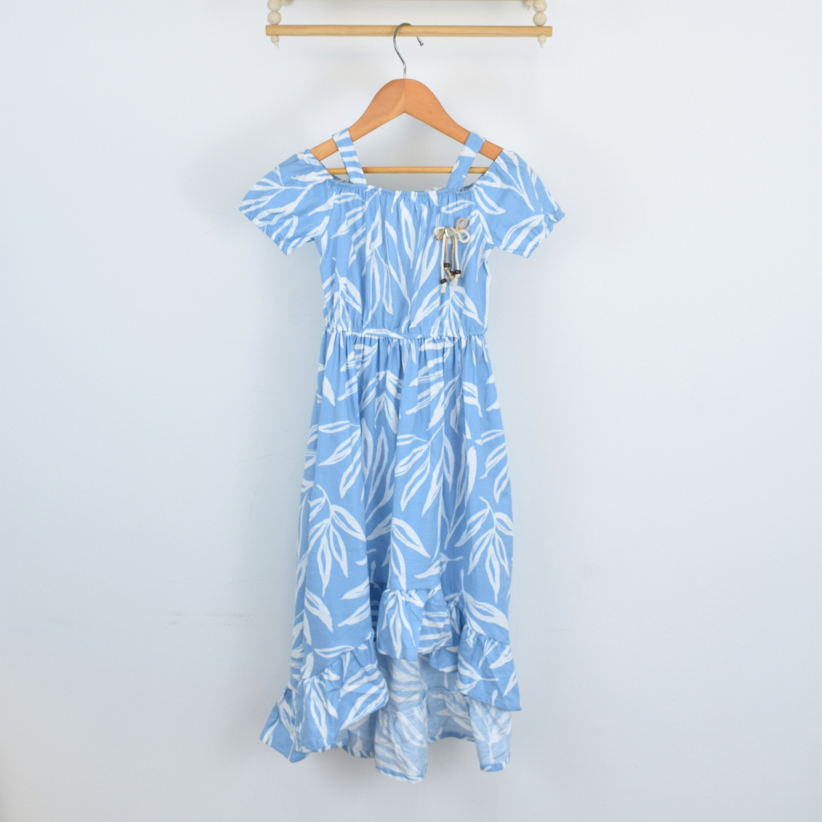 Vestido con estampado playero estilo cola de pato (más corto al frente, más largo atrás) con un sutil bolero en el borde para un movimiento delicado. Escote de hombros descubiertos con un borde fruncido y mangas cortas con elástico, ofreciendo un ajuste cómodo. Cada vestido incluye un moño decorativo de tiras con bolitas de madera.