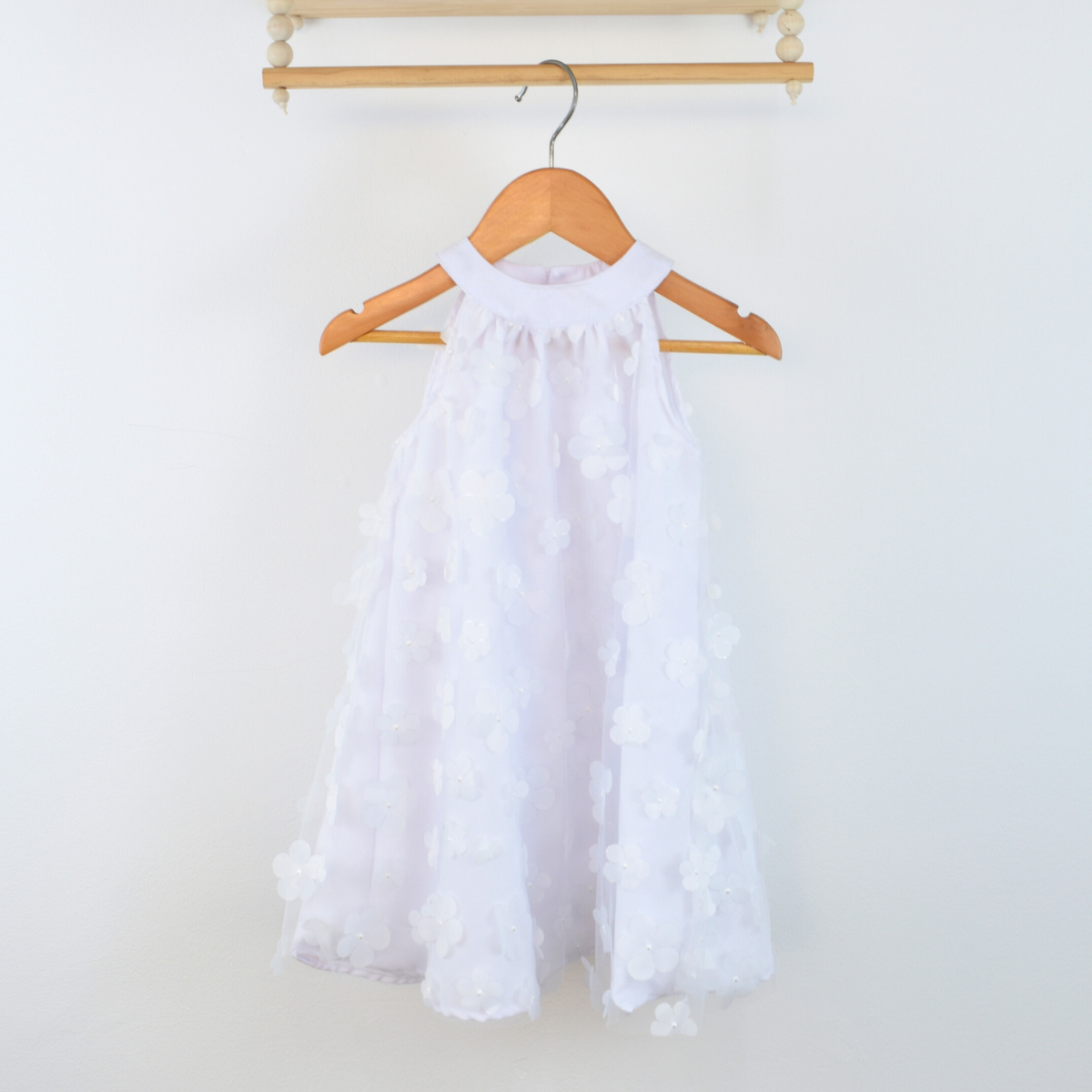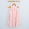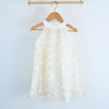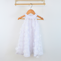 Este vestido en tul de color salmón con detalles de corazones, el blanco con detalles de flores y el beige con detalles de mariposas. Está confeccionado en tela ligera, sin mangas aportan un toque de ternura.