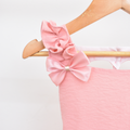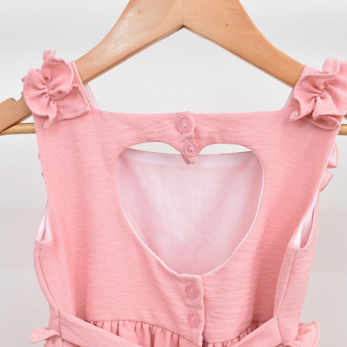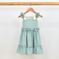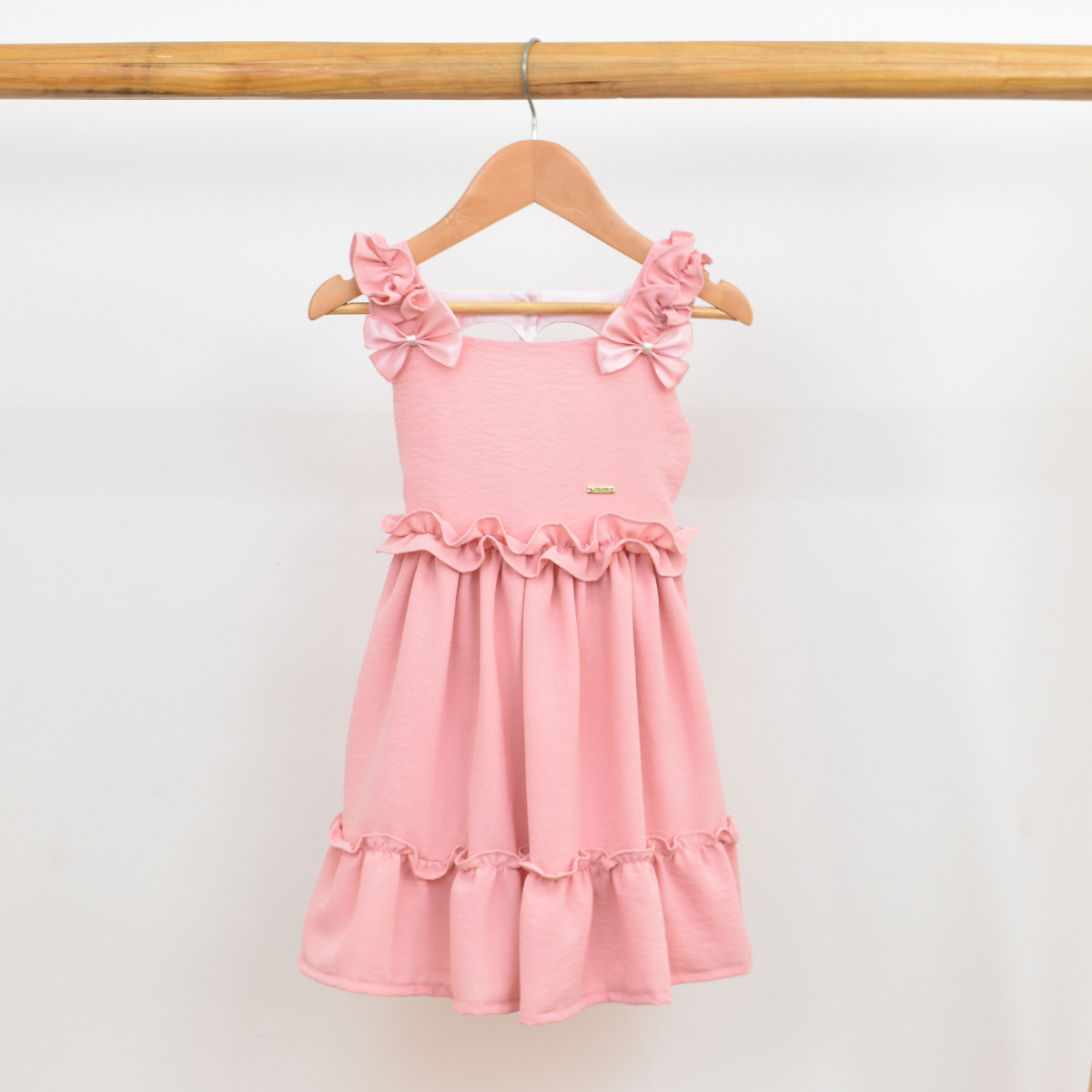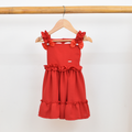 Vestido con diseño fresco y encantador, con tiras realzadas por delicados boleros y con adorable moño en los hombros. La falda incorpora un bolero bajo que aporta movimiento. Para un ajuste ideal, la espalda cuenta con botones que forma un corazón decorativo, además de una cinta para atar un moño que personaliza el ajuste a la perfección.